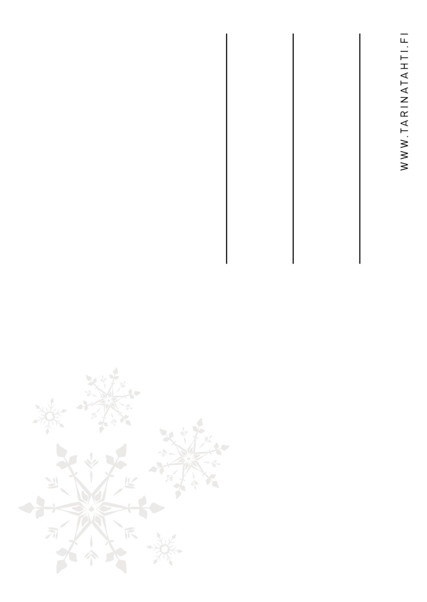 Iki-ihana tarinallinen joulukortti (10,5 cm x 14,7 cm), joka on ainutlaatuisen tarinan ja visuaalisen suunnittelun vuoksi joulun varma tunnelman luoja. Kortin teksti: