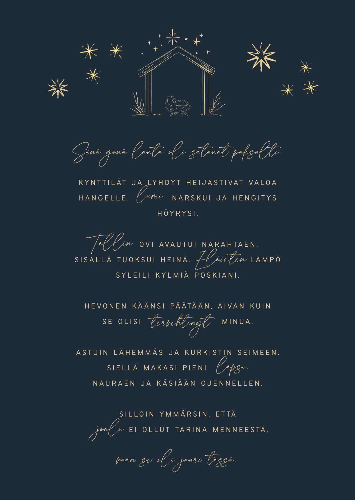Astuin lähemmäs ja kurkistin seimeen. Siellä makasi pieni lapsi, nauraen ja käsiään ojennellen.